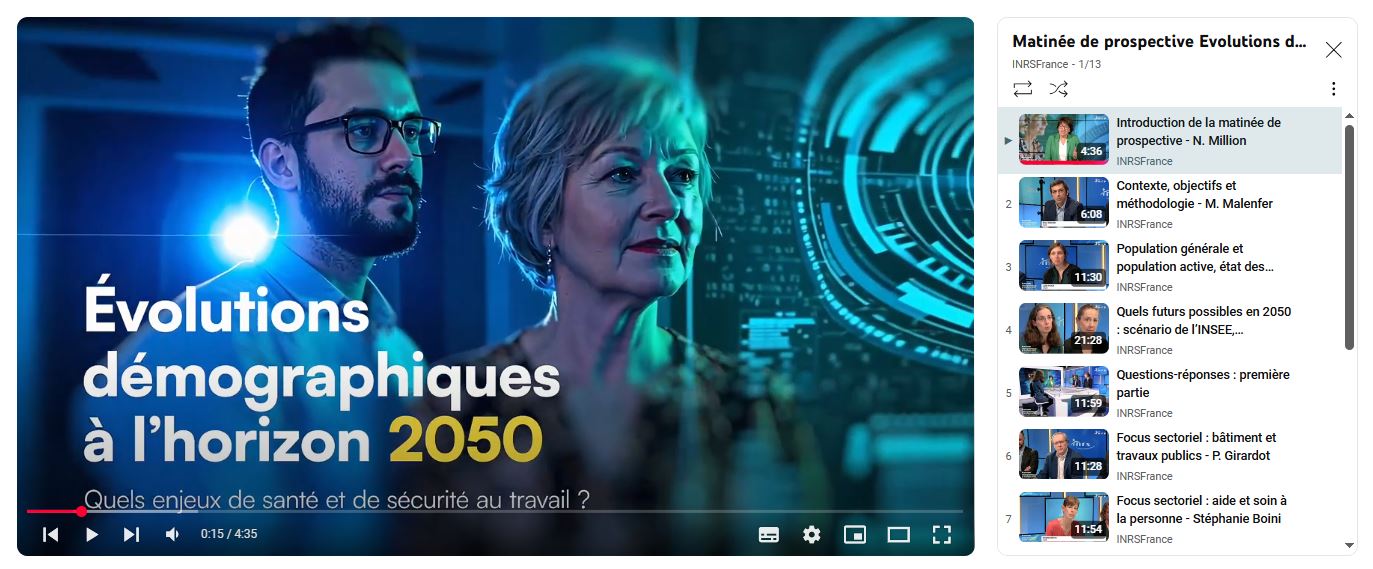 Le 1er avril 2025, l’INRS organisait une matinée de prospective consacrée au vieillissement de la population française à l’horizon 2050 et ses conséquences en matière de santé et sécurité au travail. Cet évènement a été l’occasion de présenter les résultats de l’exercice de prospective mené sur ce thème et de les mettre en débat avec les acteurs concernés : partenaires sociaux, pouvoirs publics, services de prévention et de santé au travail, responsables des ressources humaines...