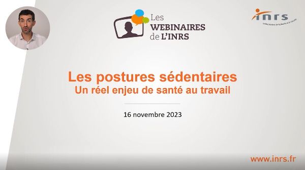 Cette conférence en ligne, présentée par Kévin Desbrosses, du département Homme au travail, et Laurent Kerangueven, du département Expertise et conseil technique, propose une vision d'ensemble de ce que sont les postures sédentaires, des risques qui y sont associés et des mesures à mettre en œuvre.