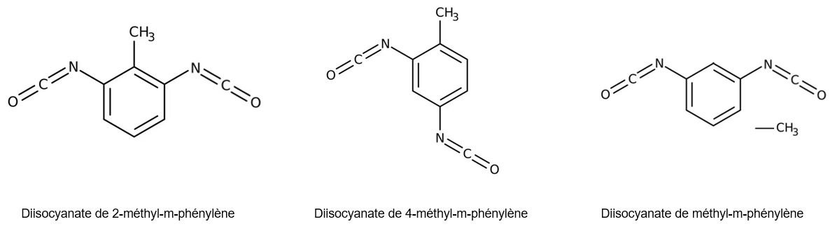 | Diisocyanate de méthyl-m-phénylène | Isocyanates | 26471-62-5 | 247-722-4 | 615-006-00-4 | TDI ; Diisocyanate de tolylène ;