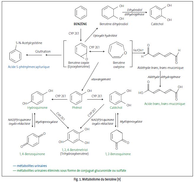 La première réaction, catalysée par le système du cytochrome P450 (CYP2E1), conduit à la formation d'époxybenzène. L'absence d'effets néfastes chez les souris knockout CYP2E1 (souris dépourvue de l'activité enzymatique CYP2E1) montre que cette étape de métabolisation est essentielle dans la toxicité du benzène [14]. En effet, les métabolites responsables des effets toxiques sont formés à partir de l'époxybenzène très réactif par différentes voies d'oxydation (cf. fig. 1).