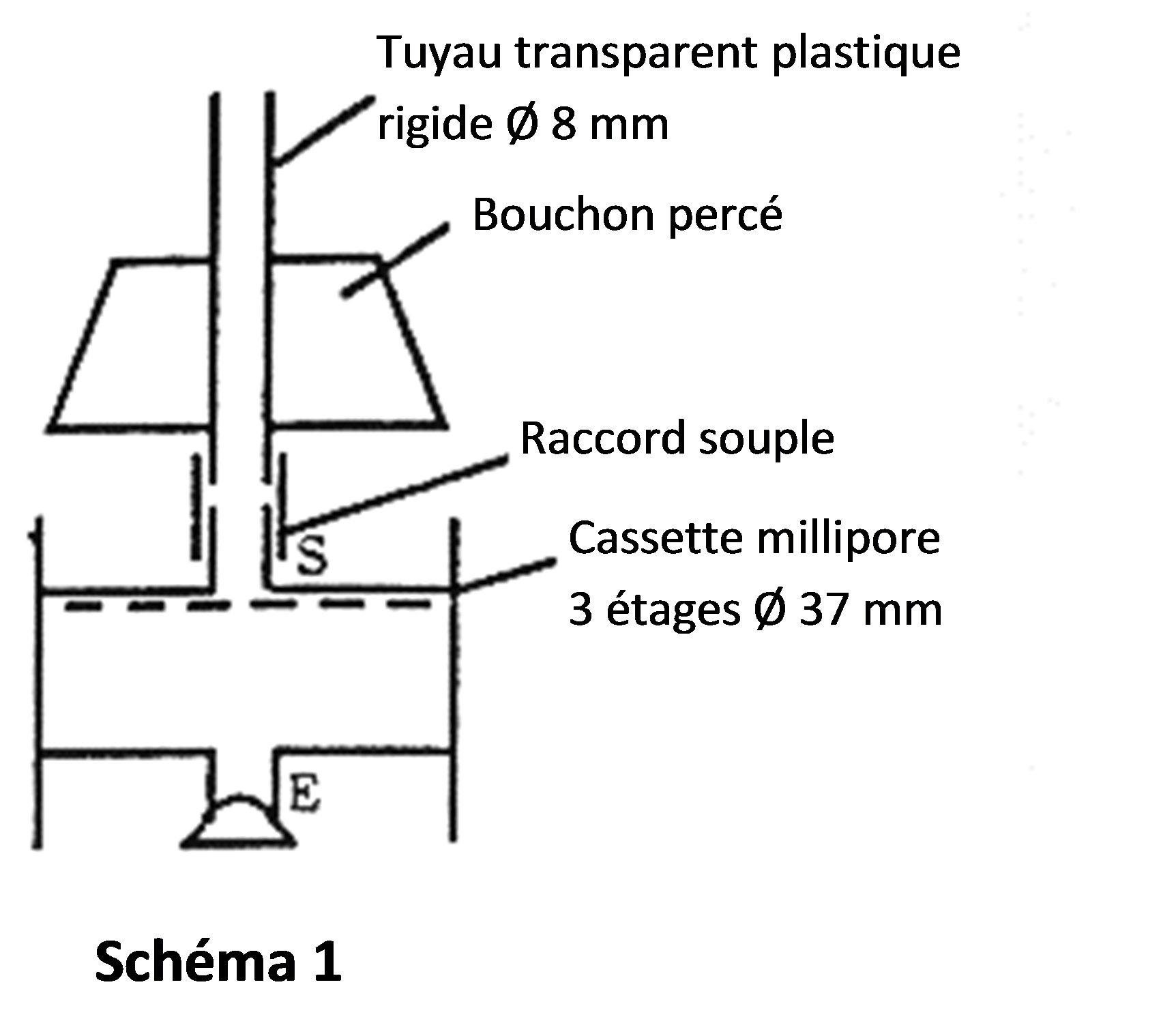 - Au bout d'une heure, retourner la cassette, ôter le bouchon puis adapter à l'orifice (S) un tuyau en plastique rigide selon le schéma 1. Retourner alors ce dispositif sur un tube ou un pilulier placé dans une fiole à vide selon le schéma 2.