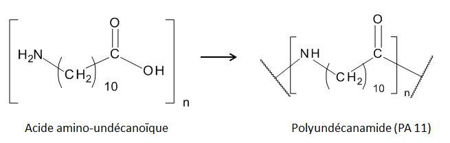 Produit à partir d’un produit bio-sourcé, l'huile de ricin, le PA 11 est utilisé dans une large gamme d’applications, de par ses propriétés : résistance chimique, résistance mécanique, facilité de mise en oeuvre, possibilité d’utilisation dans une large gamme de températures (-40 à +130°C). De plus, le PA 11 a une bonne résistance électrique et un faible coefficient de frottement ainsi qu'une faible reprise d'eau comparé aux autres polyamides. Le PA 11 trouve son emploi, entre autres, dans le secteur de l’industrie automobile (câbles, circuits d’essence, transfert de fluides pour le refroidissement et les freins, connecteurs), le pneumatique, le domaine spatial (câbles électriques, tuyaux hydrauliques, réservoir d’essence), l’industrie du câble, la pétrochimie (flexibles, tubes), l’emballage médical, l’agro-alimentaire, le textile ou le sport (raquettes, semelles, outils à skier).