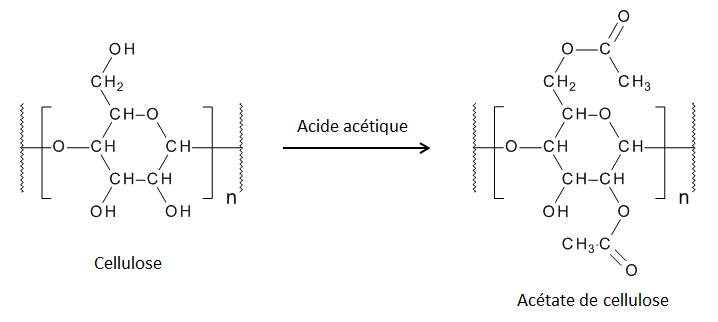 L'acétate de cellulose est obtenu par acétylation de la cellulose ; la teneur en acide acétique combiné varie d'un acétate à l'autre. Dans la pratique, les acétates de cellulose dits "secondaires", les diacétates, dont le taux d'acétylation est compris entre 51 et 57 % sont les plus utlisés.