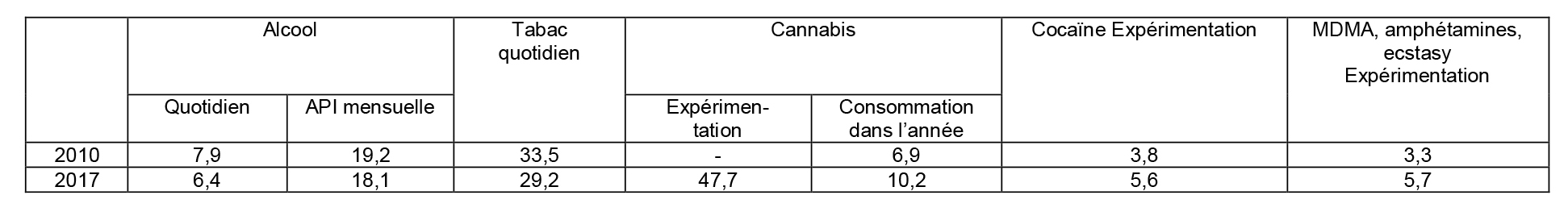 Dans le cadre du Baromètre de Santé publique France 2017, plus de 14 000 travailleurs ont été interrogé. Cette étude permet de connaître les niveaux de consommation de plusieurs substances psychoactives au sein des actifs occupés. Elle permet également de suivre les évolutions par rapport à 2010.