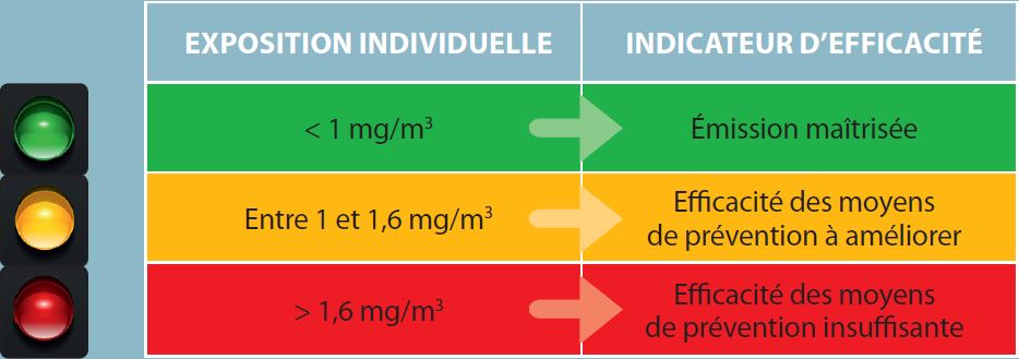 Dans ce but, l’INRS a développé la méthode Metropol M2, seule méthode valable pour tous les bitumes utilisés en France et à laquelle il convient désormais de se référer. À partir des mesures de concentrations de la totalité des molécules présentes dans les fumées, une estimation de l’exposition globale au mélange est faite. Quant aux résultats, ils sont interprétés à l’aide de la grille suivante qui évalue l’efficacité des moyens de prévention et la maîtrise de l’exposition.