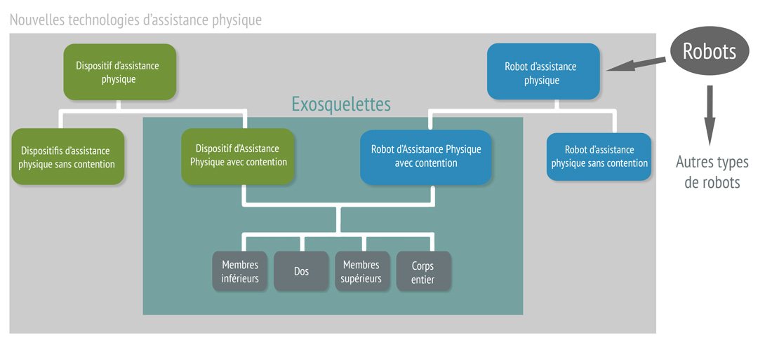Les exosquelettes, qui s’inscrivent dans un ensemble de nouvelles technologies d’assistance physique (Cf. schéma), posent toutefois de nouvelles questions relatives à la santé et à la sécurité des opérateurs. D’une part, l’opérateur peut être exposé aux risques classiques inhérents aux machines (risques mécaniques, électriques, thermiques, liés au bruit et aux vibrations, etc.). D’autre part, les changements apportés dans les façons de travailler, du point de vue des stratégies gestuelles comme du point de vue de l’organisation du travail, peuvent être source de postures contraignantes, de stress, de fatigue cognitive (surcharge informationnelle), de troubles proprioceptifs ou encore de perte d’équilibre ou de chute.