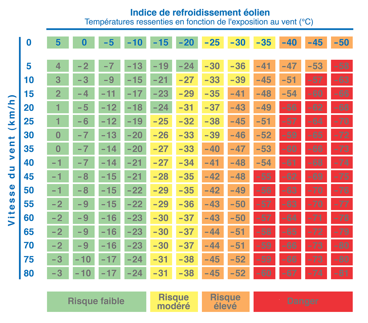 Des niveaux de danger d’une exposition au froid peuvent être établis à partir de cet indice.