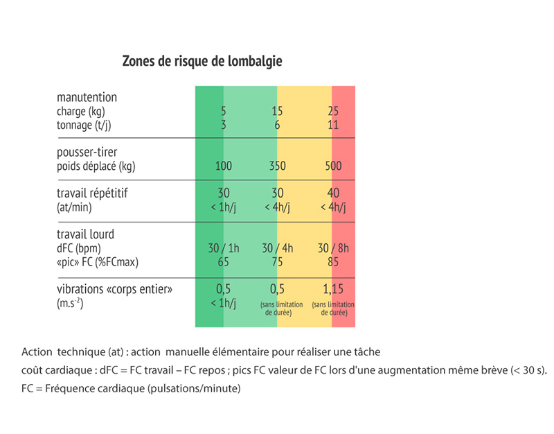 Toutes les contraintes ne sont pas listées dans ce tableau. Cependant, appliquer ces limites permet de rester en deçà des limites de risque des autres facteurs de contraintes non indiqués dans le tableau car difficiles à quantifier (organisation du travail, forces à exercer, modes de manutention…) ou qui font l'objet de développements longs dans des revues de la littérature, des normes ou des paramètres individuels.