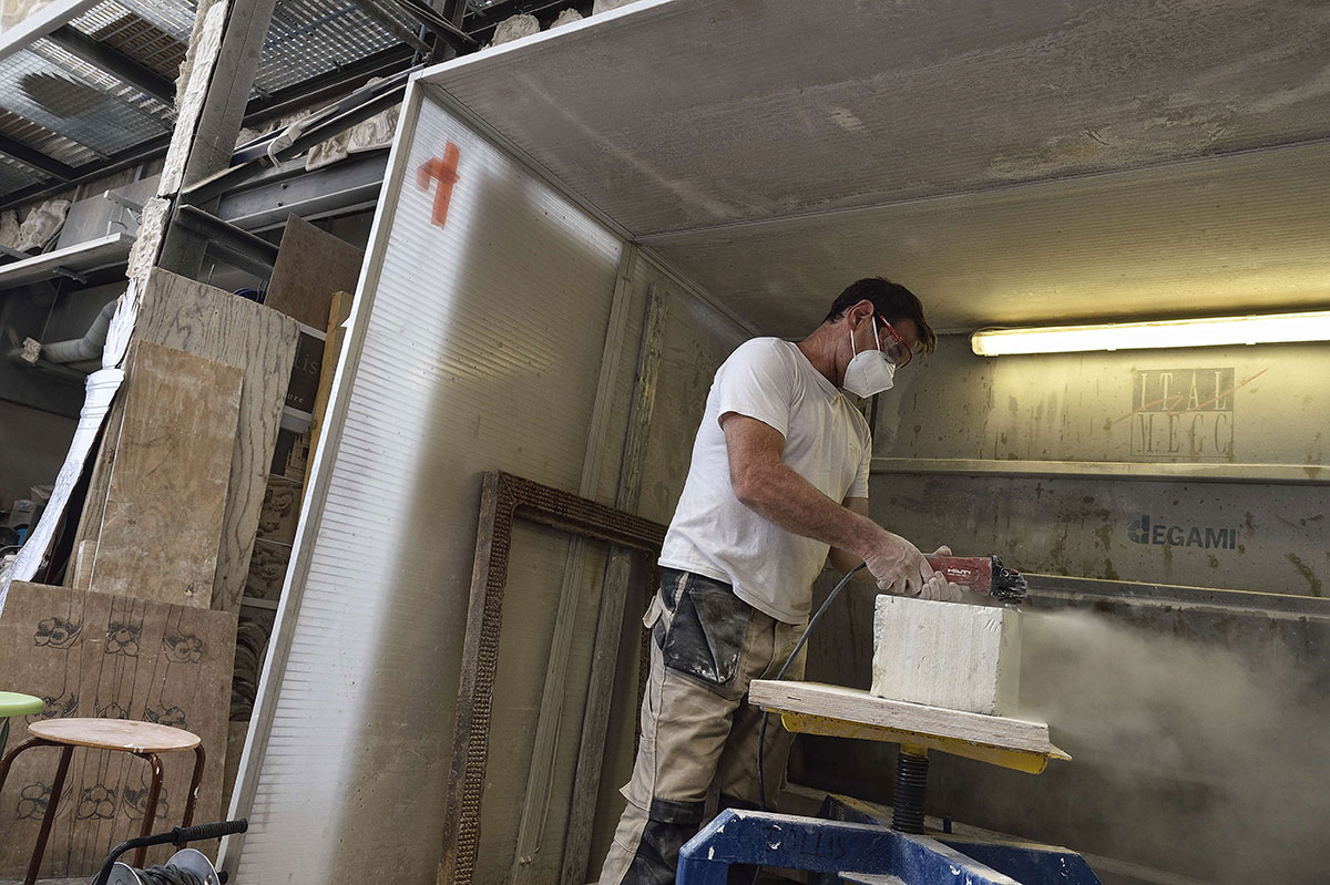 - en abattant les poussières par pulvérisation d’eau, sur les tronçonneuses utilisées pour la découpe de bordure de trottoirs par exemple.