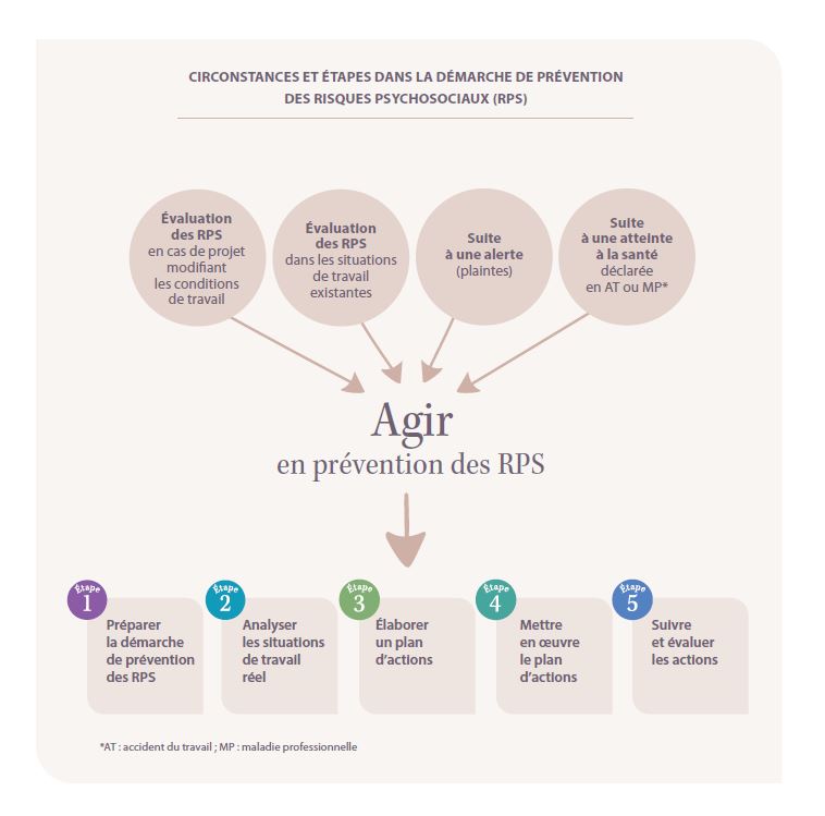 La démarche proposée répond à quatre circonstances pour agir en prévention des RPS et cinq étapes.