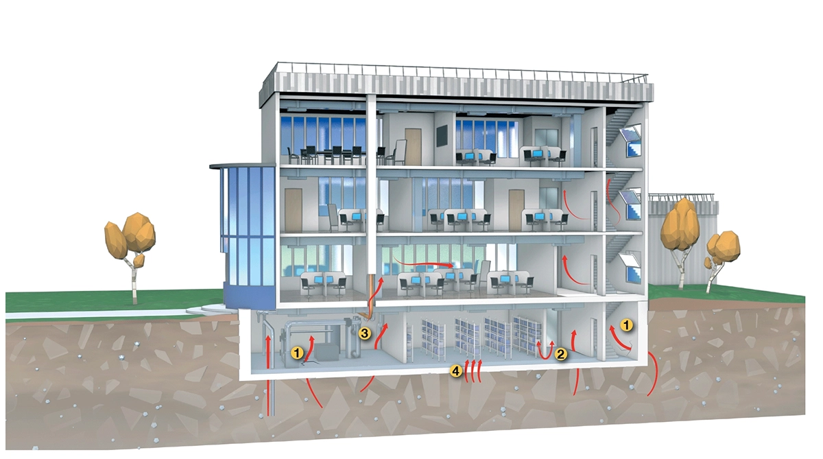 Le traitement du soubassement permet d’agir à la source et de réduire efficacement l’entrée du radon dans les bâtiments. Il consiste soit à ventiler le soubassement par aération naturelle ou à l’aide d’une ventilation mécanique, soit à le mettre en dépression par rapport aux espaces occupés à l’aide d’un système d’extraction mécanique.