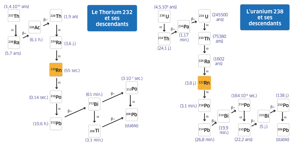 Ces radionucléides se désintègrent, ce qui aboutit à la formation du radon 222, radon 220 et radon 219. Les deux premiers radioisotopes, compte tenu de leur durée de vie (période respective de 3,8 jours et 55 secondes), ont le temps de migrer depuis le sous-sol où ils sont produits vers l’air extérieur. Le radon 219 a une durée de vie (période de 3,9 secondes) trop courte pour atteindre l’air extérieur en grande quantité et ainsi contribuer significativement à l’exposition des personnes. Seul le radon 222 est considéré dans la suite de ce dossier. Ces différents isotopes du radon vont à leur tour se désintégrer pour donner des isotopes du polonium, du plomb et du bismuth. Certains de ces radionucléides sont des éléments solides de durée de vie courte. On les appelle « descendants solides à vie courte » du radon (voir figure ci-dessous).