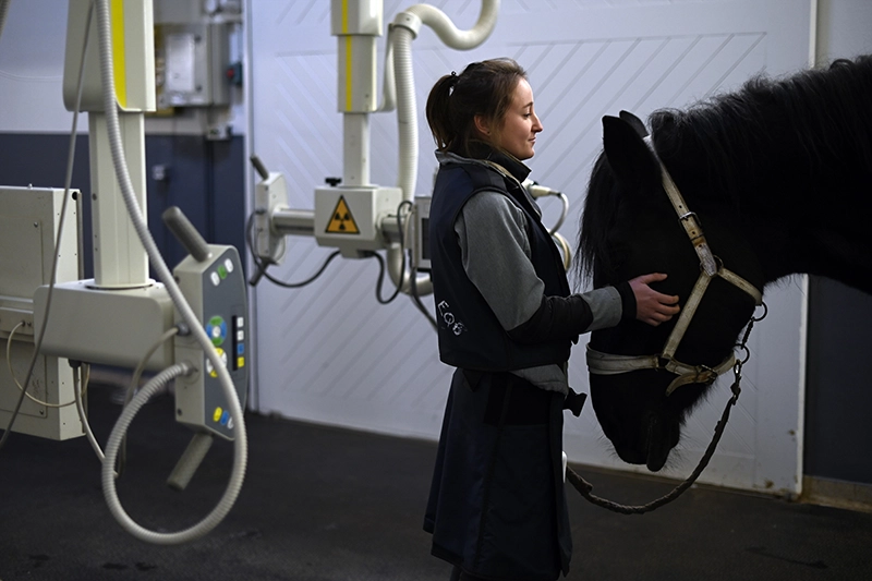 • Une opératrice de radiographie vétérinaire équipée d'un tablier de plomb