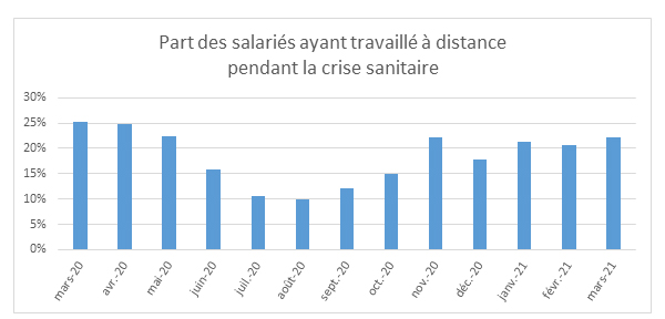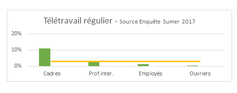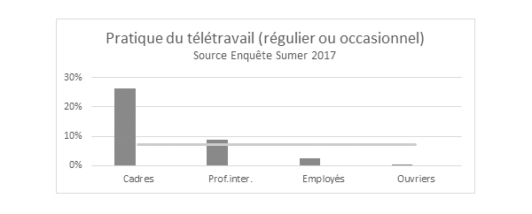 La pratique du télétravail (régulier ou occasionnel) était donc de 7,2 % chez les salariés (soit 1,8 millions de salariés). Chez les cadres, ce taux était de 26 %.