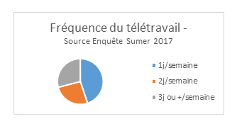 Parmi les télétravailleurs réguliers de 2017 : 45 % le pratiquaient 1 jour par semaine, 26 % 2 jours par semaine et 29 % 3 jours par semaine ou plus.