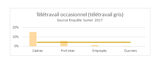 Jusqu’en 2017, d’un point de vue réglementaire, le télétravail devait être volontaire, régulier et mis en place dans le cadre du contrat de travail ou d’un avenant à celui-ci. L’ordonnance du 22 septembre 2017 étend le champ du télétravail à une pratique occasionnelle et, en l’absence d’accord collectif ou de charte d’entreprise, assouplit sa mise en œuvre. Avant septembre 2017, la pratique du télétravail non régulier correspondait à du télétravail « gris » car il n’était pas prévu par le contrat de travail ou par un accord collectif (Source : Dares Analyse, novembre 2019).