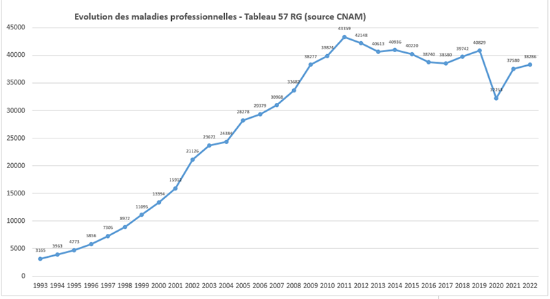 Les TMS reconnus au titre du tableau 57 RG n'ont cessé d'augmenter entre 1993 et 2011 avant de se stabiliser à partir de 2012 autour de 40 000 par an. Il est à noter une inflexion en 2020 qui est due à la pandémie du Covid.