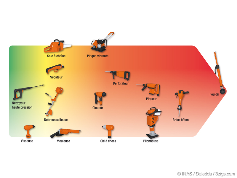 Dans l’infographie ci-dessous, les machines les plus courantes sont placées en fonction de leur niveau de vibration moyen connu. Les machines situées dans la zone verte exposent faiblement les opérateurs.