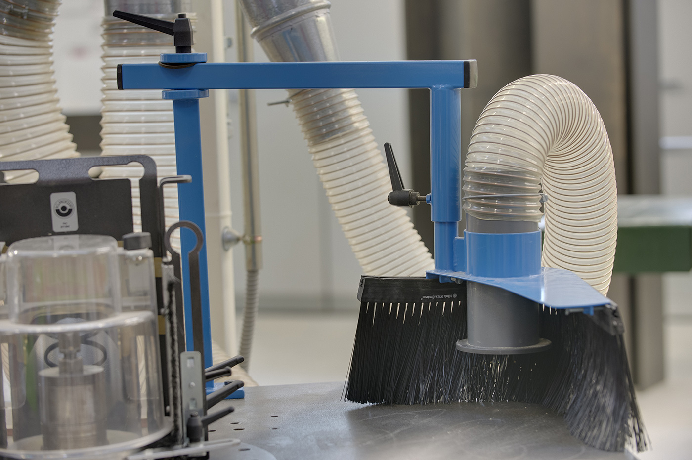 - Capteur, fixé sur la potence réglable en hauteur (comprenant un rideau de brosses profilées destiné à stopper les copeaux et poussières éjectés lors de l’usinage et une buse d’un diamètre de 8 cm).