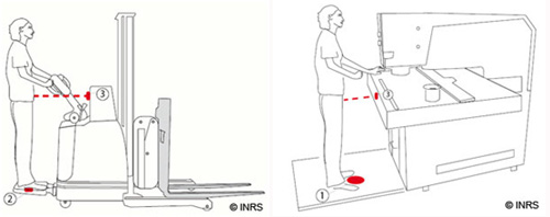 Positionnement de Vib@Work Floor, exposimètre pour la mesure des vibrations au plancher : (1) Vib@Work Seat, (2) Vib@Work Floor